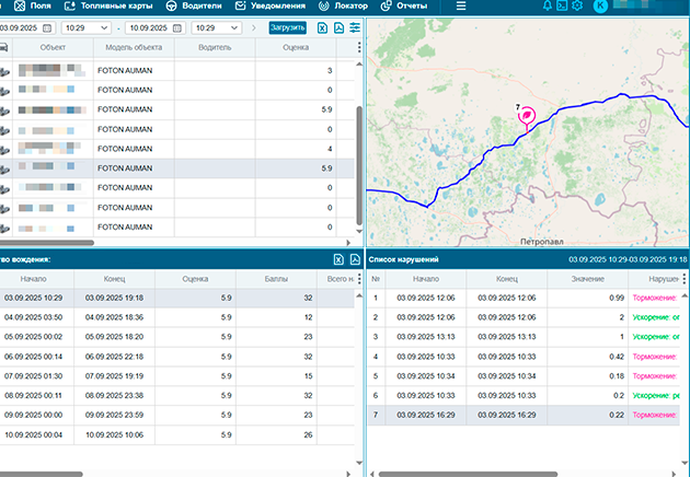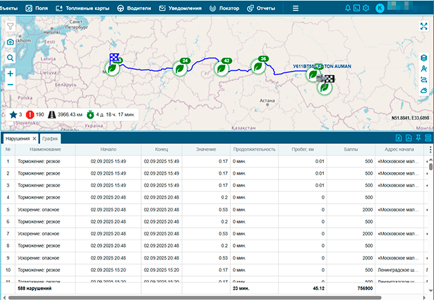 Анализ агрессивных манёвров, резких торможений, ускорений на основе данных с датчиков терминалов. Позволяет снижать риски ДТП, продлевать срок службы техники и повышать безопасность.