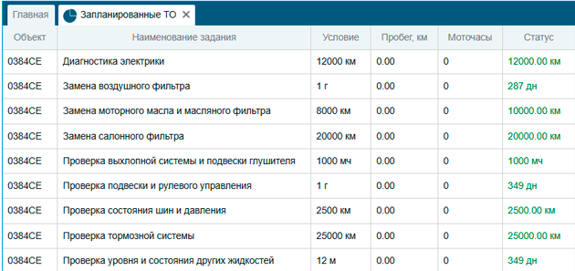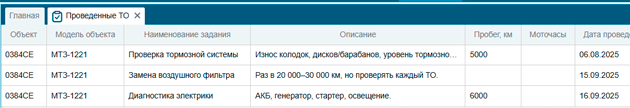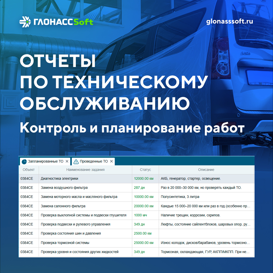 Благодаря специальным отчетам «Проведенные ТО» и «Запланированные ТО» возможно контролировать и планировать сервисные мероприятия и вести учет технического состояния исходя из пробега или моточасов которые отработал объект. Регулярный технический осмотр - залог долговечности транспортных средств.